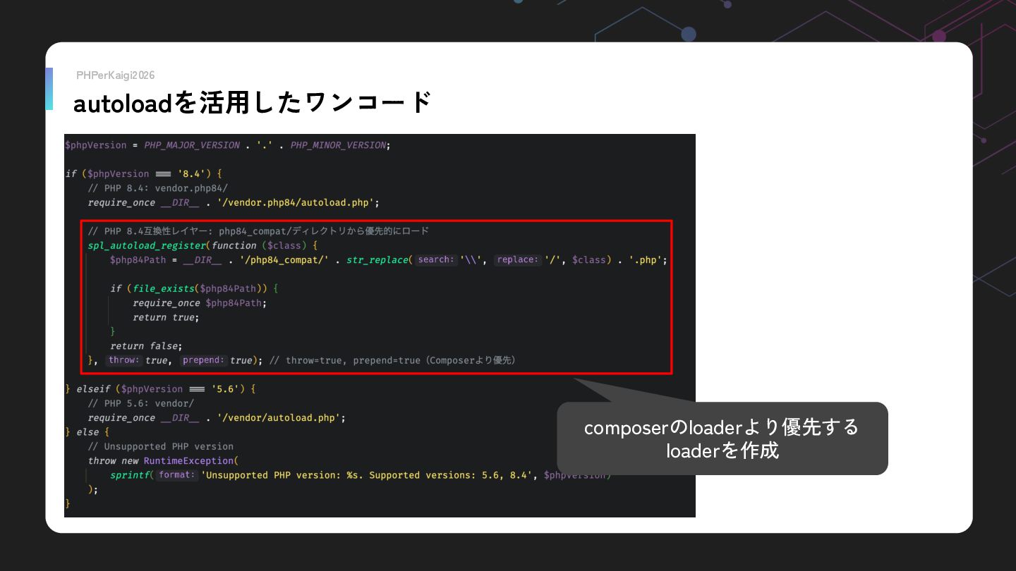 PHPerKaigi2026 autoloadを活用したワンコード composerのloaderより優先する loaderを作成