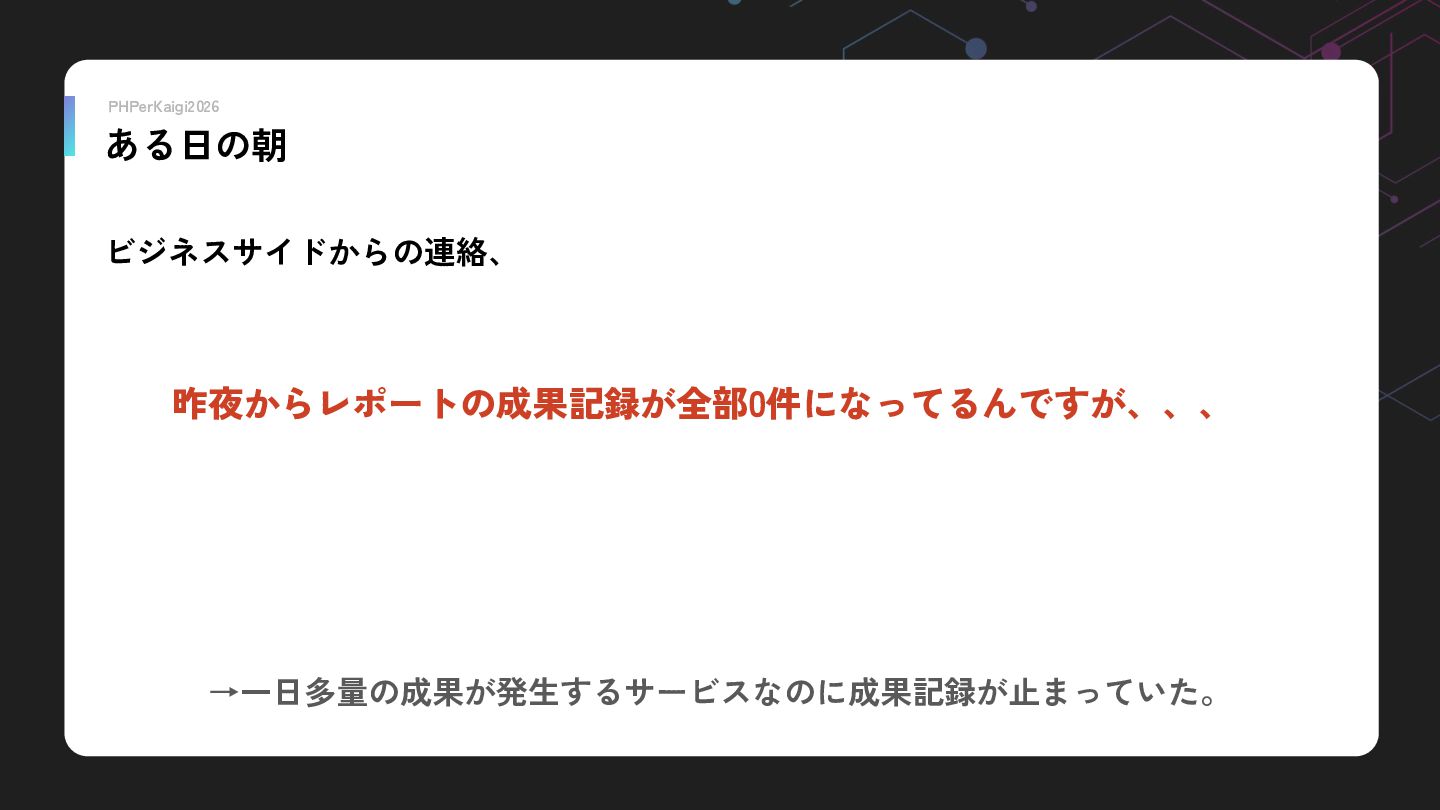 PHPerKaigi2026 ある日の朝 ビジネスサイドからの連絡、 昨夜からレポートの成果記録が全部0件になってるんですが、、、 →一日多量の成果が発生するサービスなのに成果記録が止まっていた。