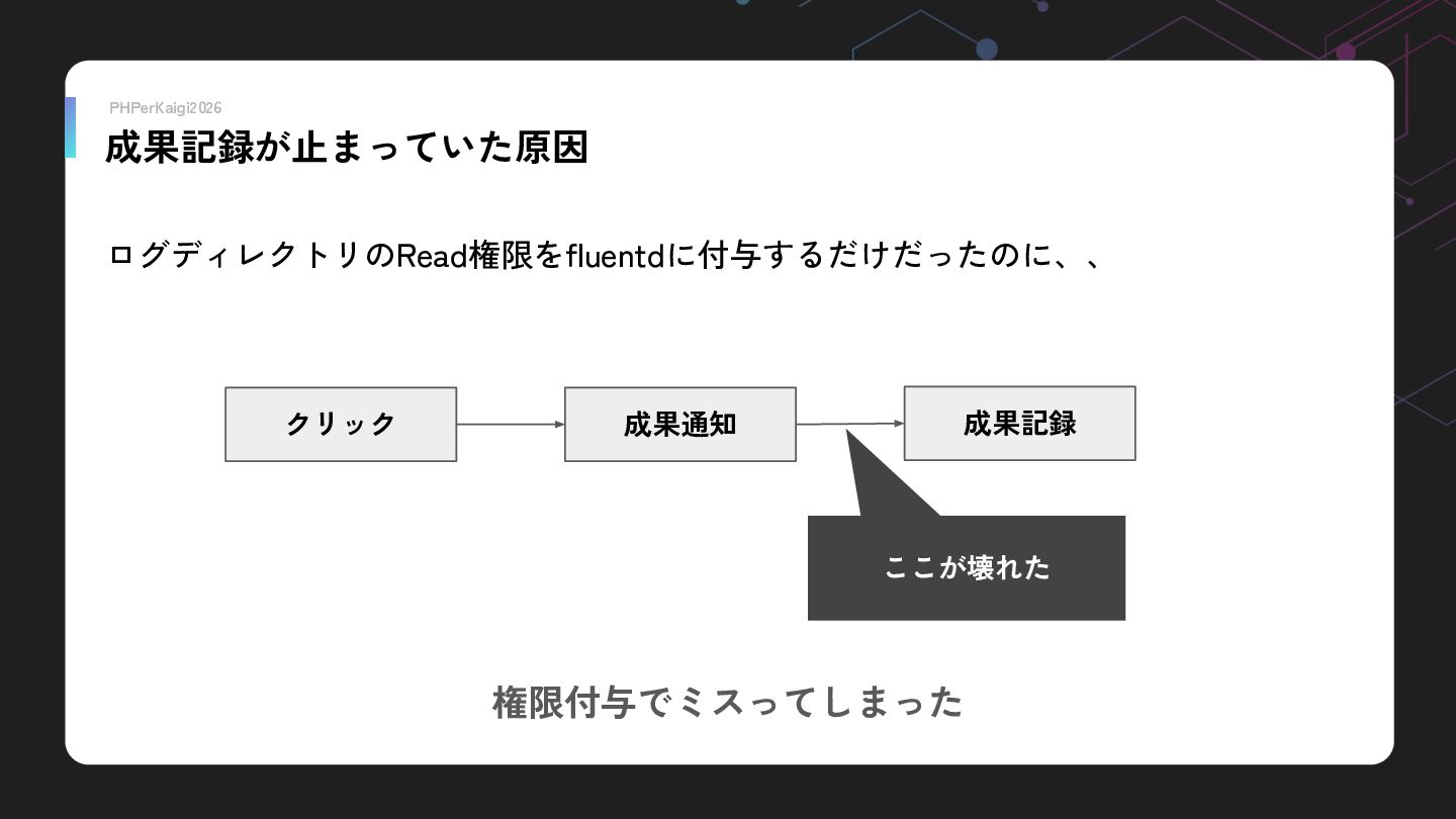 PHPerKaigi2026 成果記録が止まっていた原因 ログディレクトリのRead権限をfluentdに付与するだけだったのに、、 権限付与でミスってしまった クリック 成果通知 成果記録 ここが壊れた