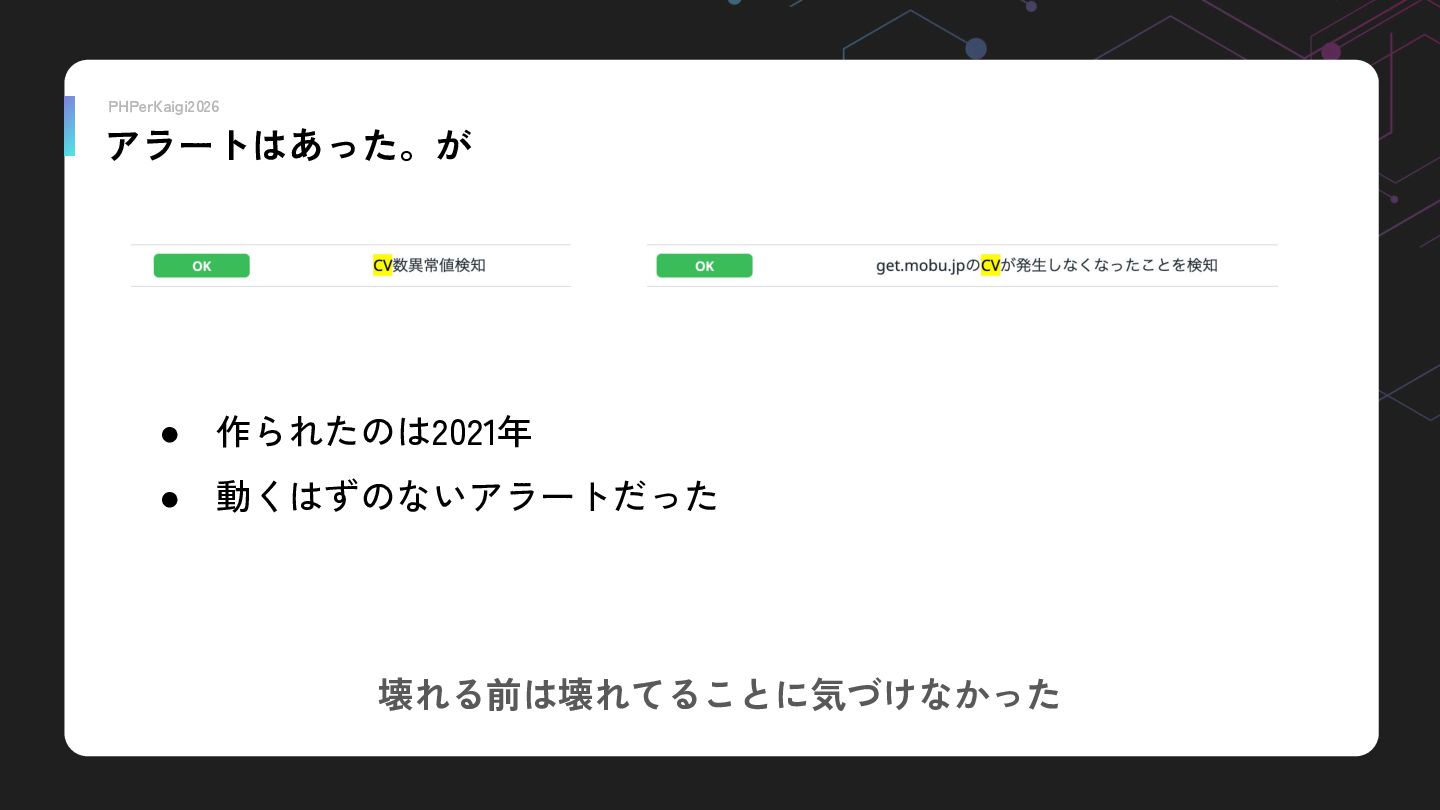 PHPerKaigi2026 アラートはあった。が 壊れる前は壊れてることに気づけなかった • 作られたのは2021年 • 動くはずのないアラートだった