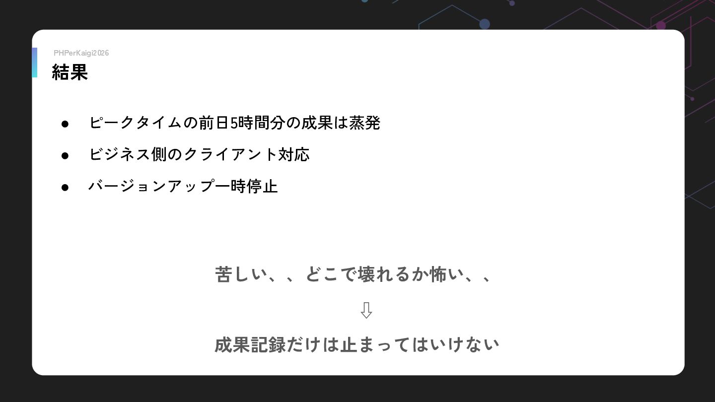 PHPerKaigi2026 結果 • ピークタイムの前日5時間分の成果は蒸発 • ビジネス側のクライアント対応 • バージョンアップ一時停止 成果記録だけは止まってはいけない 苦しい、、どこで壊れるか怖い、、