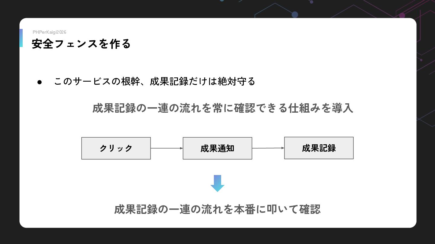 PHPerKaigi2026 安全フェンスを作る • このサービスの根幹、成果記録だけは絶対守る 成果記録の一連の流れを本番に叩いて確認 成果記録の一連の流れを常に確認できる仕組みを導入 クリック 成果通知 成果記録