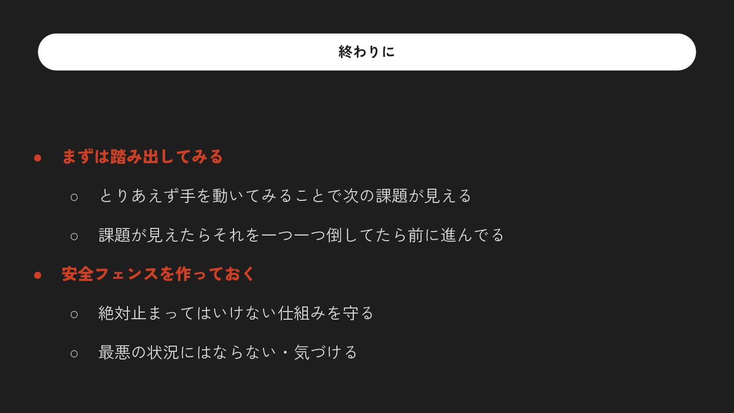 終わりに • まずは踏み出してみる ◦ とりあえず手を動いてみることで次の課題が見える ◦ 課題が見えたらそれを一つ一つ倒してたら前に進んでる • 安全フェンスを作っておく ◦