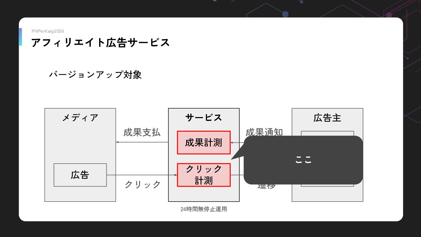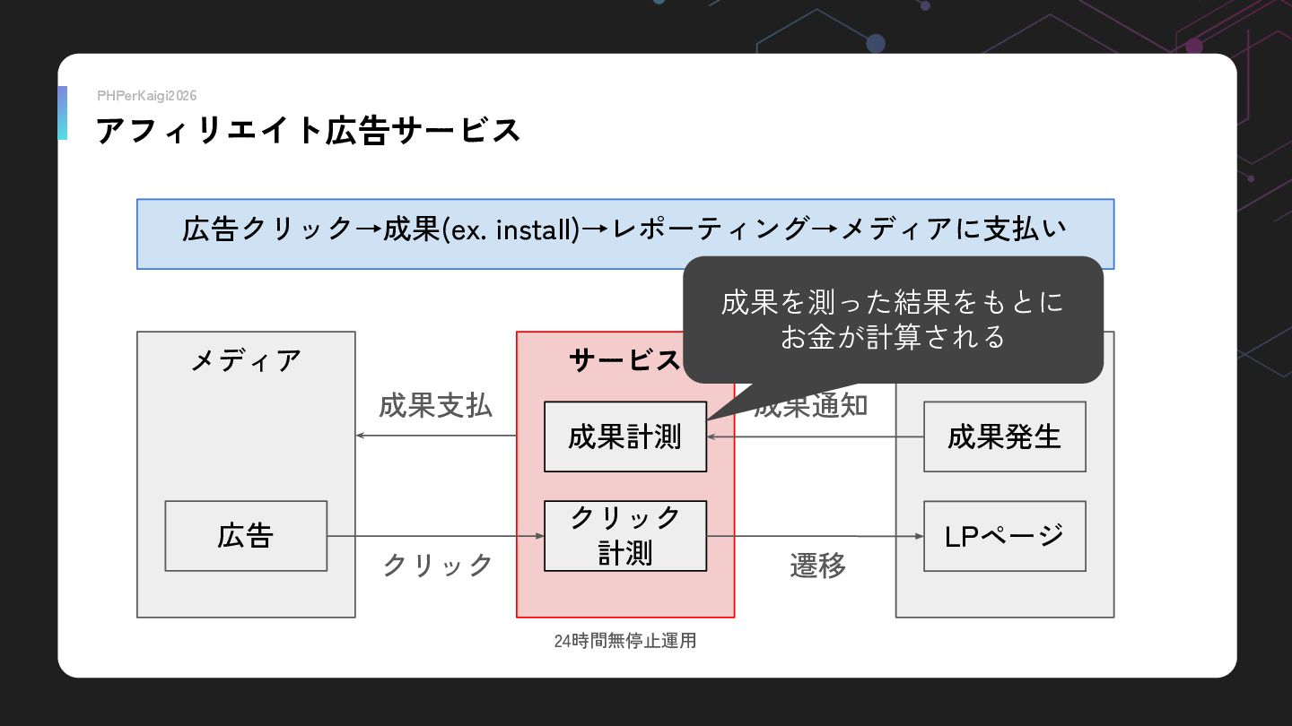 PHPerKaigi2026 アフィリエイト広告サービス メディア 広告 サービス 広告主 クリック 計測 成果計測 成果発生