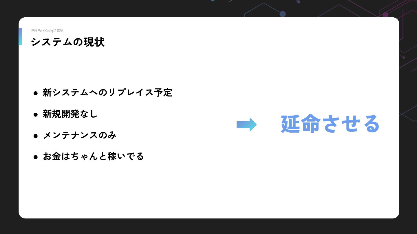 PHPerKaigi2026 システムの現状 • 新システムへのリプレイス予定 • 新規開発なし • メンテナンスのみ • お金はちゃんと稼いでる
