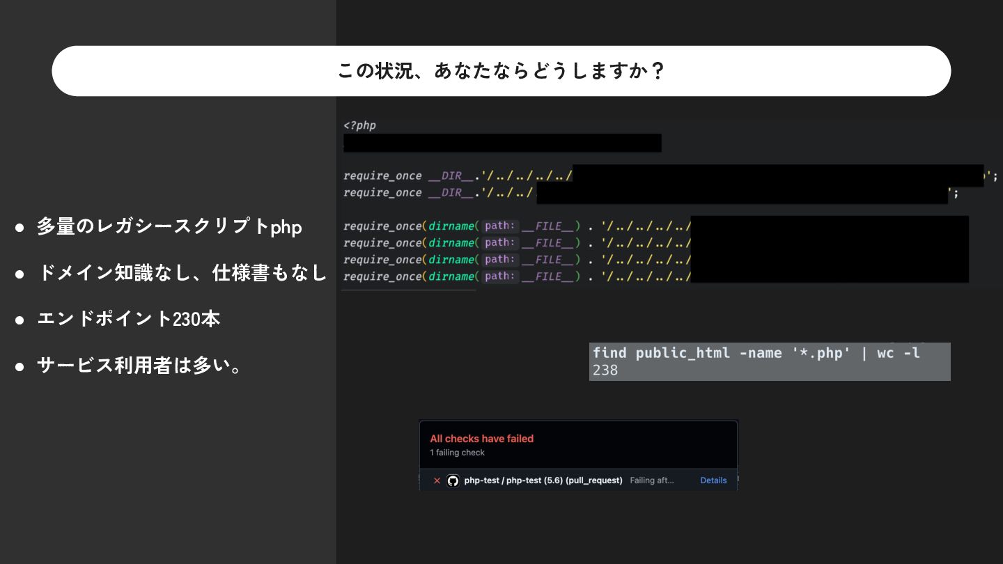 • 多量のレガシースクリプトphp • ドメイン知識なし、仕様書もなし • エンドポイント230本 • サービス利用者は多い。 この状況、あなたならどうしますか?
