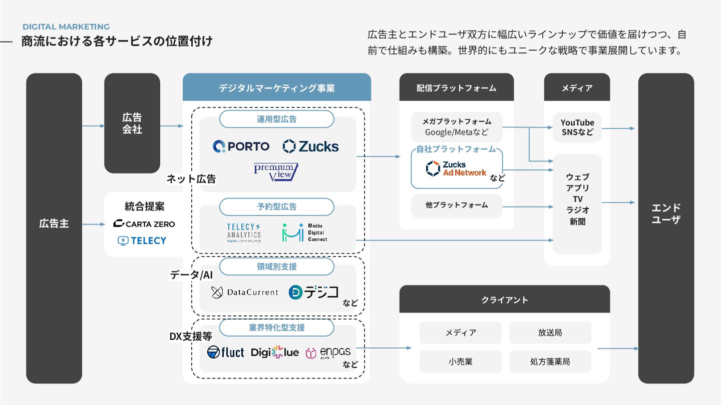 配信プラットフォーム メディア 広告主 エンド ユーザ 統合提案 YouTube SNSなど ウェブ アプリ TV ラジオ 新聞 DIGITAL MARKETING 運⽤型広告 予約型広告 領域別⽀援 業界特化型⽀援 広告主とエンドユーザ双⽅に幅広いラインナップで価値を届けつつ、⾃ 前で仕組みも構築。世界的にもユニークな戦略で事業展開しています。 クライアント 他プラットフォーム ネット広告 データ/AI DX⽀援等 ⾃社プラットフォーム など など など