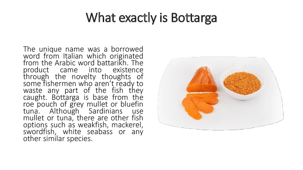 word from Italian which originated from the Arabic word battarikh. The product came into existence through the novelty thoughts of some fishermen who aren’t ready to waste any part of the fish they caught. Bottarga is base from the roe pouch of grey mullet or bluefin tuna. Although Sardinians use mullet or tuna, there are other fish options such as weakfish, mackerel, swordfish, white seabass or any other similar species.