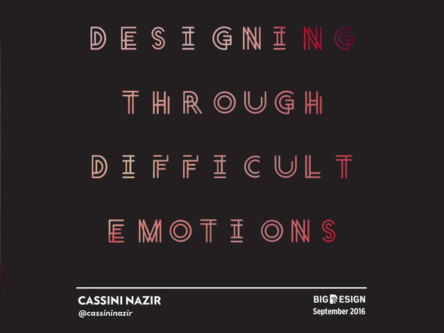 without having sufficient evidence of their thoughts. FORTUNE-TELLING You predict the future negatively: things will get worse, or there is danger ahead. CATASTROPHIZING You believe that what has happened or will happen will be so awful and unbearable that you won’t be able to stand it. ALWAYS & NEVER You believe that an unpleasant situation that’s irritating you will always be that way and never change. NEGATIVE FILTERING You focus almost exclusively on the negatives and seldom notice the positives. “He thinks I’m a loser” “I won’t get that job” “It would be terrible if I failed” “Look at all the people who don’t like me” “I always make a fool of myself when presenting” 24 7 “I don’t know what he think, but it’s okay if he thinks I’m a loser” “I don’t know what tomorrow may bring, but I can do my best to prepare” “I’d rather not fail, but if I do I can handle it. I’ll learn from my mistakes.” “There are people enjoy my company” “I can prepare more to have an outstanding presentation” CASSINI NAZIR · DESIGNING THROUGH DIFFICULT EMOTiONS · BIG DESIGN 2016