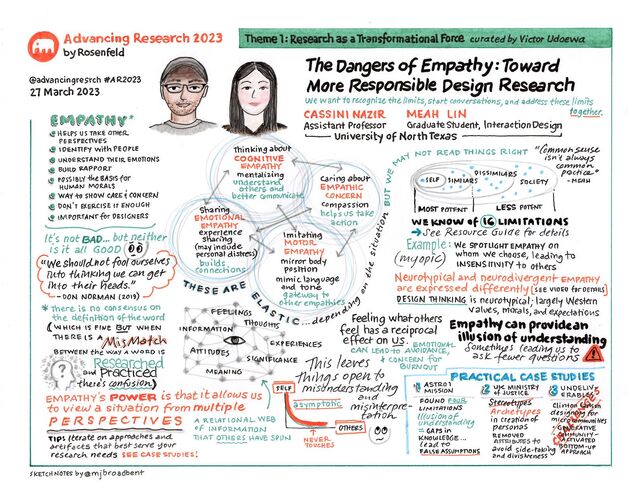 This talk explores the 'edges of empathy' and shows how and why two additional emotive capacities should be cultivated: curiosity and care. Three short case studies demonstrate that when these two capacities are added to empathy, they can lead to more generative research and richer insights.