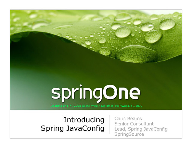 is released at Milestone 4 (1.0.0.M4) •Work is underway on M5 •M5 will track Spring 3.0 •Spring 3.0 will include core elements of JavaConfig •JavaConfig 1.0 GA will release with (or shortly after) Spring 3.0 GA