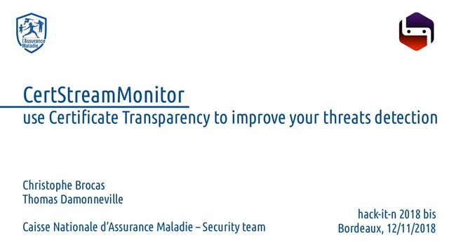 (*) Signed Certificate Timestamp TLS answer with cert + SCT TLS answer with cert + SCT TLS answer with cert + SCT Chrome 68 requires CT for all certificates signed after 30 April 2018. Safari does it since October 2018. 6 TLS answer with cert + SCT 5 5 4 sends certificate+SCT 3 Receive SCT (*) 2 Log pre-certificate 1 Ask for a certificate Site web CA Web site Logs Monitors Browser TLS request