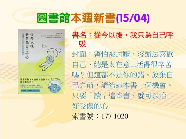 圖書館本週新書(15/04) 書名:從今以後,我只為自己呼 吸 封面:害怕被討厭、沒辦法喜歡 自己、總是太在意...活得很辛苦 嗎?但這都不是你的錯。放棄自 己之前,請給這本書一個機會。 只要「讀」這本書,就可以治 好受傷的心 索書號:177