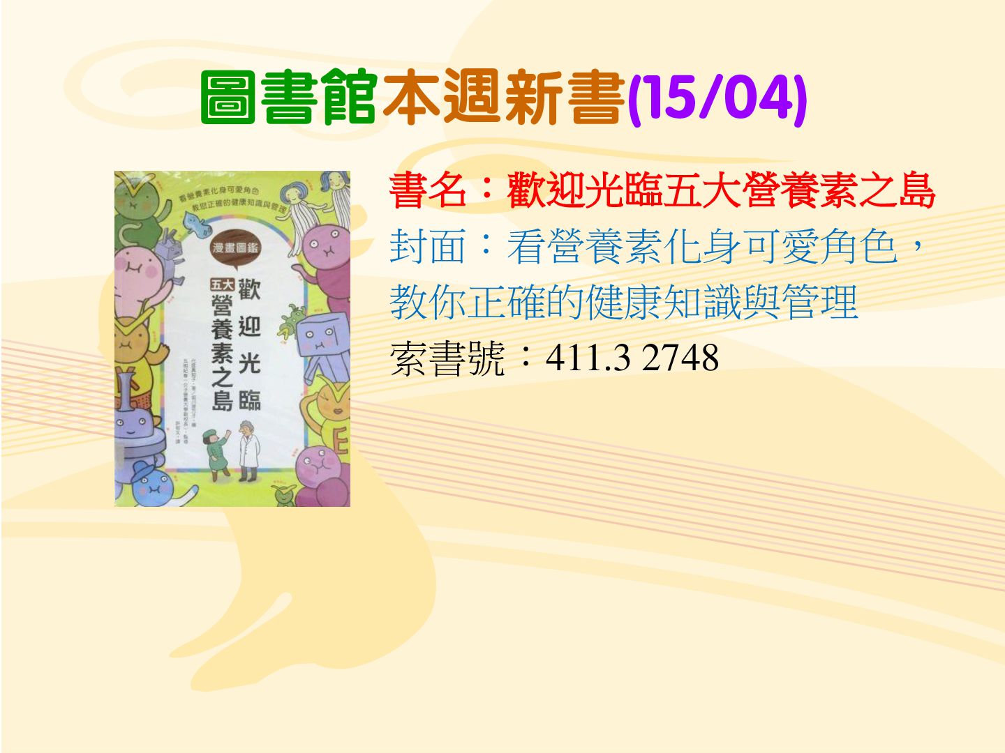 圖書館本週新書(15/04) 書名:歡迎光臨五大營養素之島 封面:看營養素化身可愛角色, 教你正確的健康知識與管理 索書號:411.3 2748
