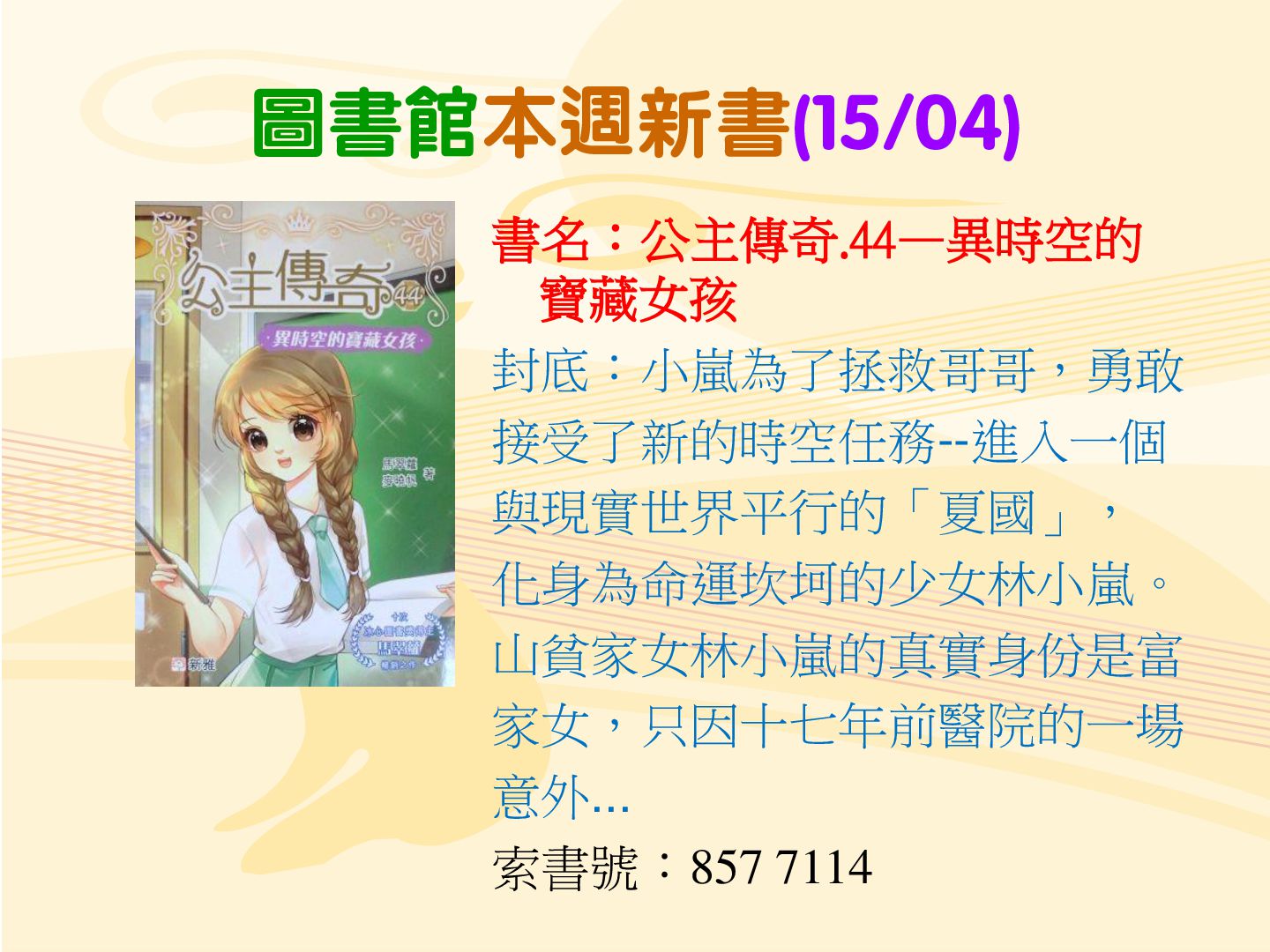 圖書館本週新書(15/04) 書名:公主傳奇.44—異時空的 寶藏女孩 封底:小嵐為了拯救哥哥,勇敢 接受了新的時空任務--進入一個 與現實世界平行的「夏國」, 化身為命運坎坷的少女林小嵐。 山貧家女林小嵐的真實身份是富 家女,只因十七年前醫院的一場 意外...