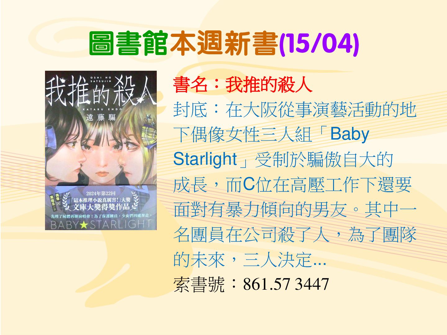 圖書館本週新書(15/04) 書名:我推的殺人 封底:在大阪從事演藝活動的地 下偶像女性三人組「Baby Starlight」受制於騙傲自大的 成長,而C位在高壓工作下還要 面對有暴力傾向的男友。其中一 名團員在公司殺了人,為了團隊 的未來,三人決定... 索書號:861.57