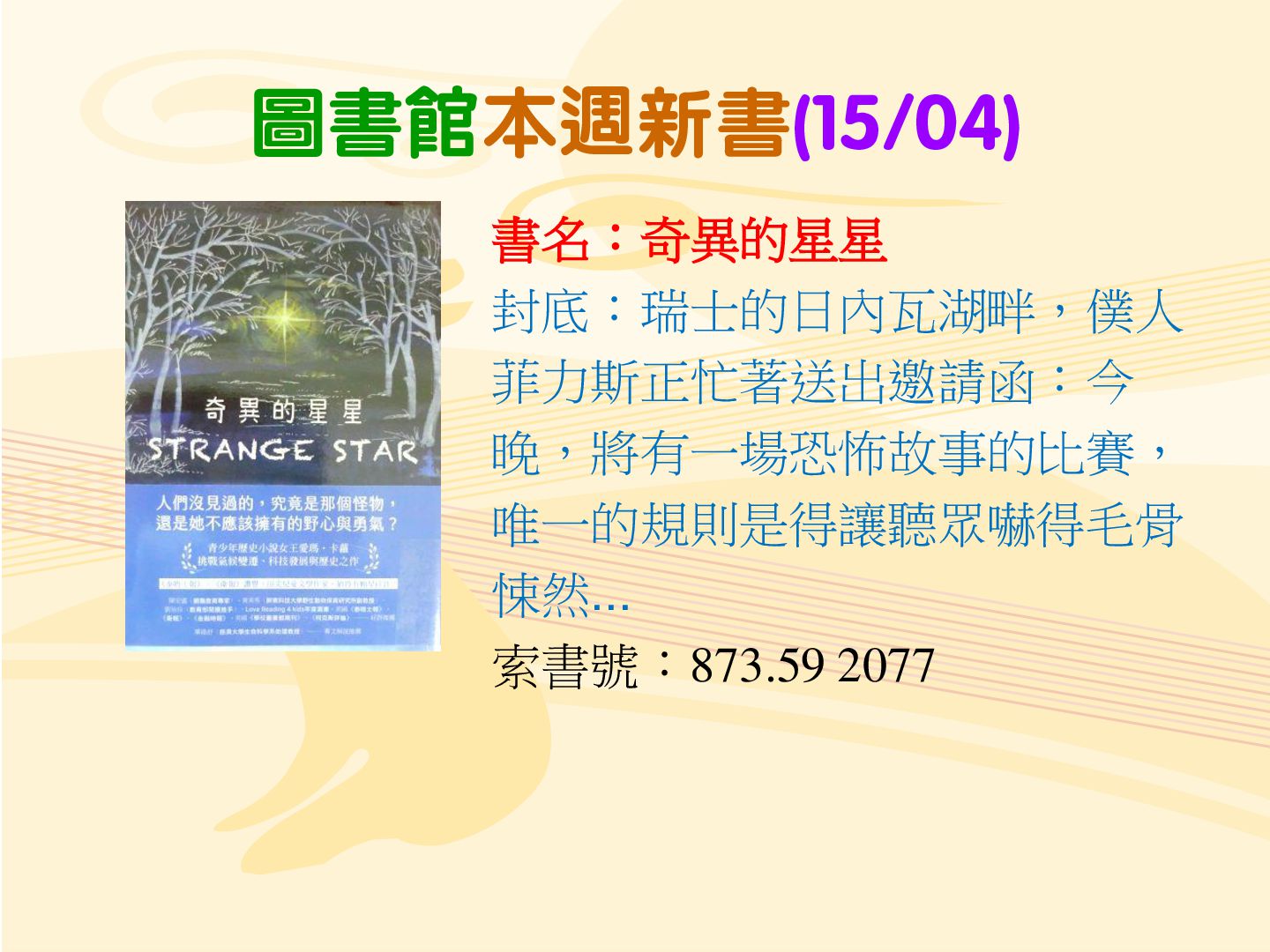 圖書館本週新書(15/04) 書名:奇異的星星 封底:瑞士的日內瓦湖畔,僕人 菲力斯正忙著送出邀請函:今 晚,將有一場恐怖故事的比賽, 唯一的規則是得讓聽眾嚇得毛骨 悚然... 索書號:873.59 2077