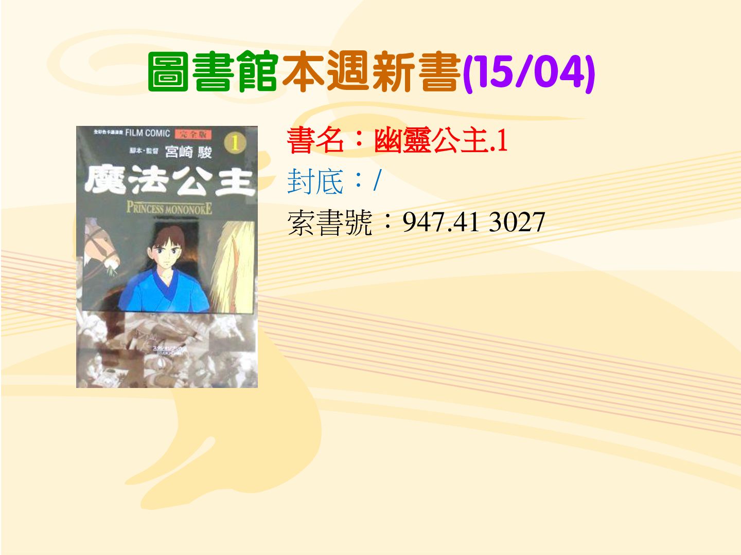 圖書館本週新書(15/04) 書名:幽靈公主.1 封底:/ 索書號:947.41 3027