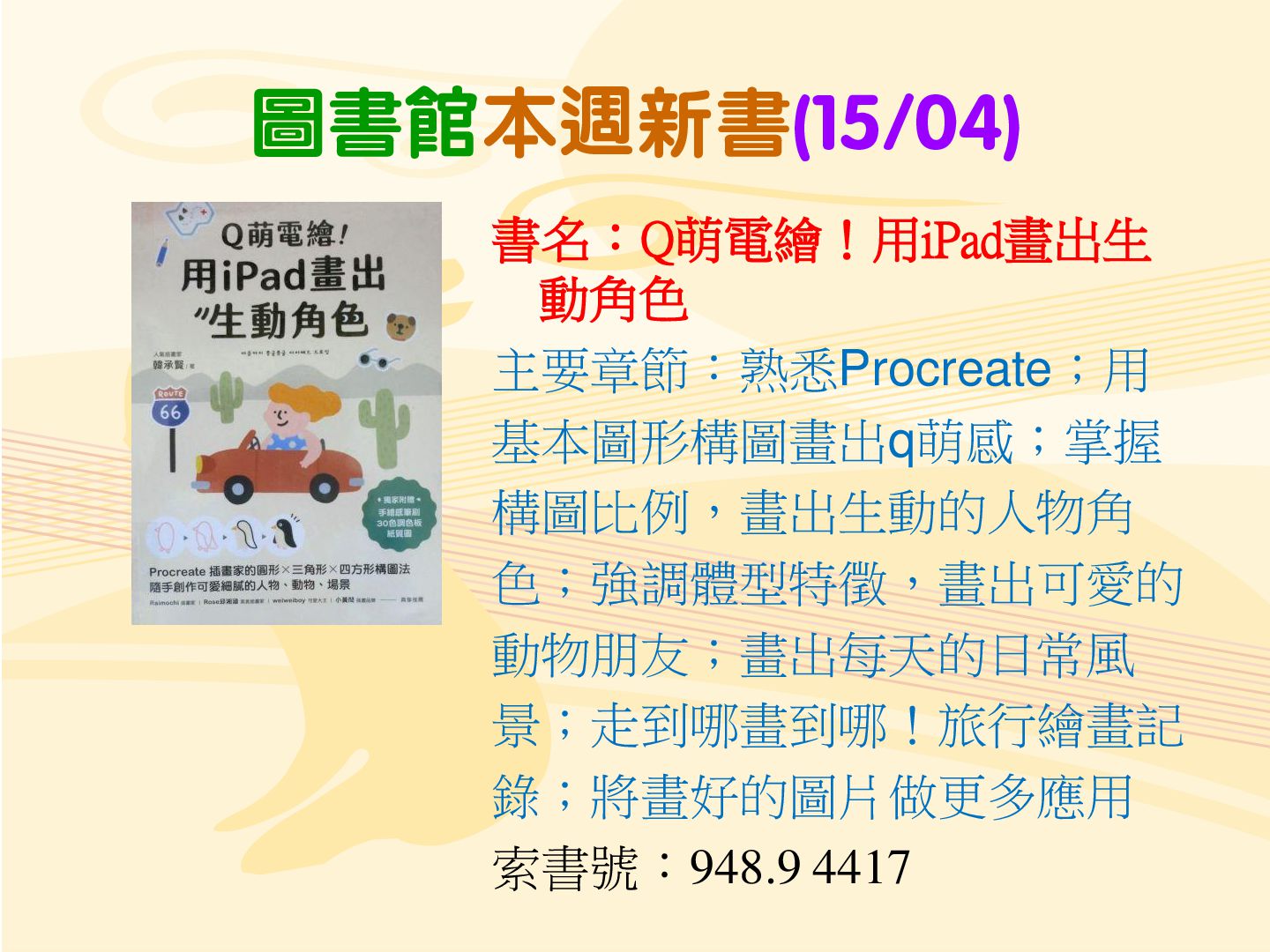 圖書館本週新書(15/04) 書名:Q萌電繪!用iPad畫出生 動角色 主要章節:熟悉Procreate;用 基本圖形構圖畫出q萌感;掌握 構圖比例,畫出生動的人物角 色;強調體型特徵,畫出可愛的 動物朋友;畫出每天的日常風 景;走到哪畫到哪!旅行繪畫記 錄;將畫好的圖片做更多應用