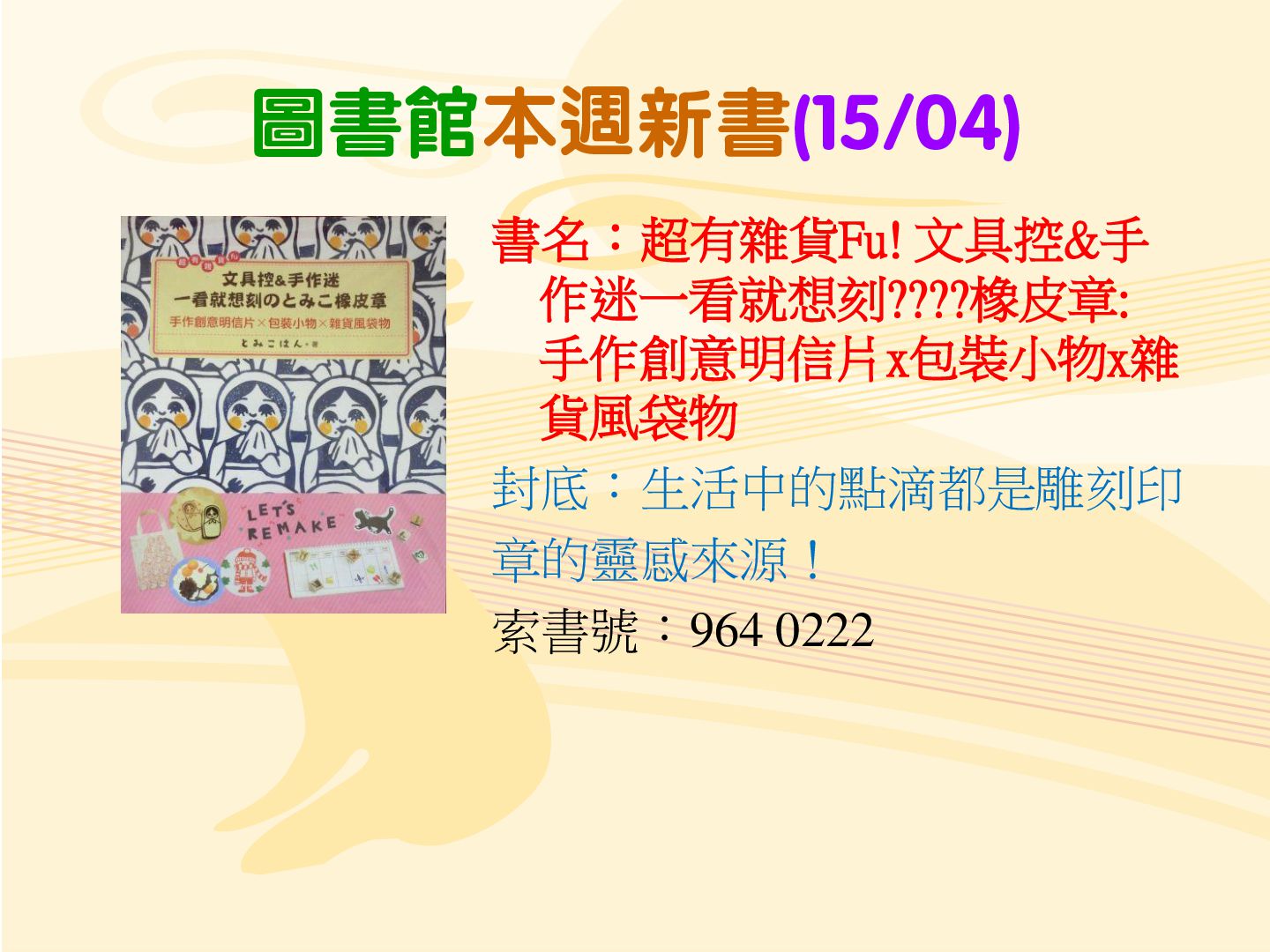 圖書館本週新書(15/04) 書名:超有雜貨Fu! 文具控&手 作迷一看就想刻????橡皮章: 手作創意明信片x包裝小物x雜 貨風袋物 封底:生活中的點滴都是雕刻印 章的靈感來源! 索書號:964 0222