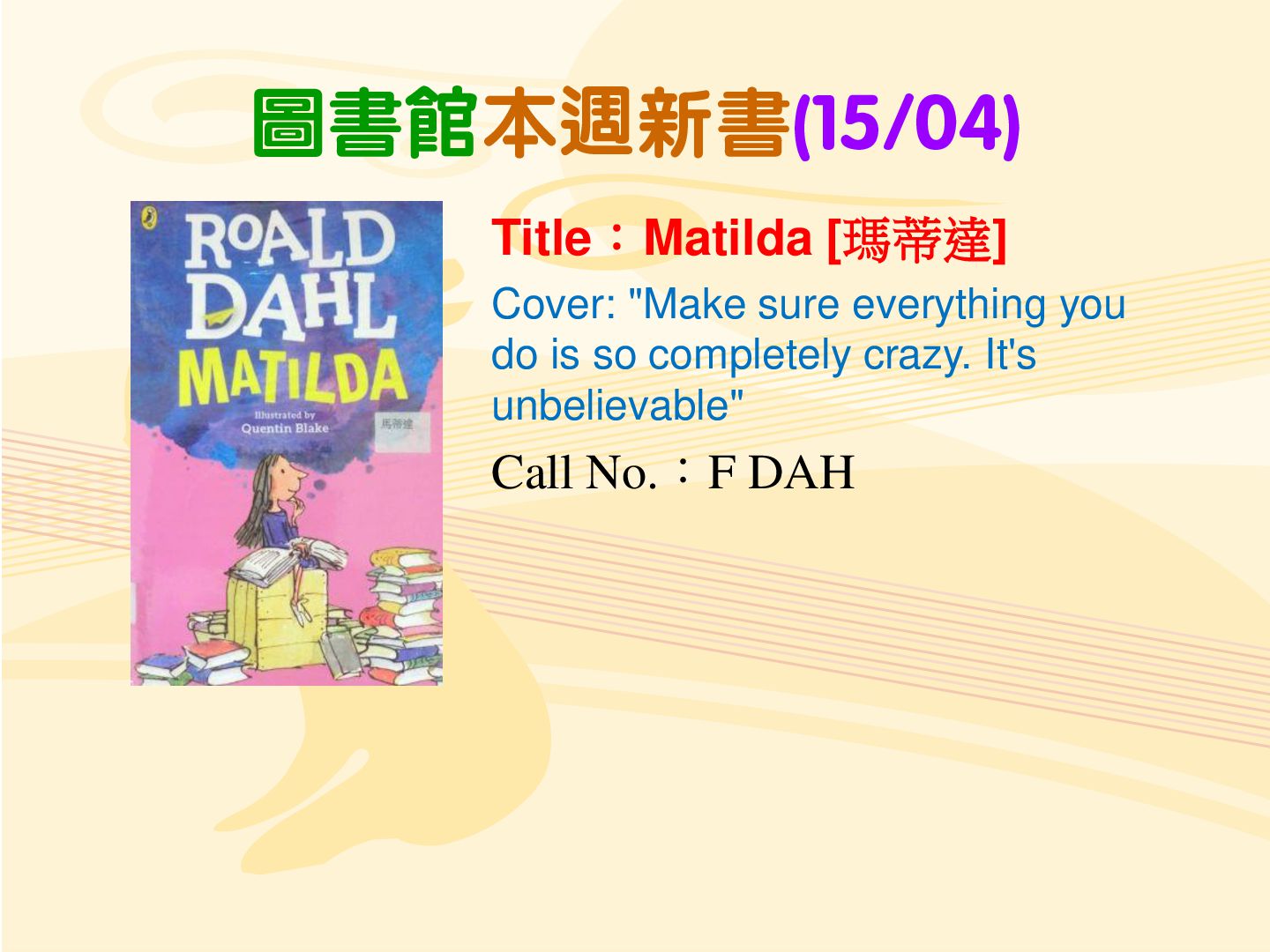 圖書館本週新書(15/04) Title:Matilda [瑪蒂達] Cover: "Make sure everything you do is
