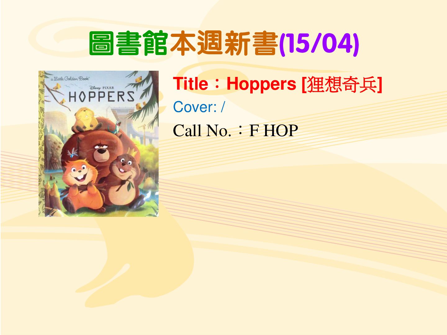 圖書館本週新書(15/04) Title:Hoppers [狸想奇兵] Cover: / Call No.:F HOP