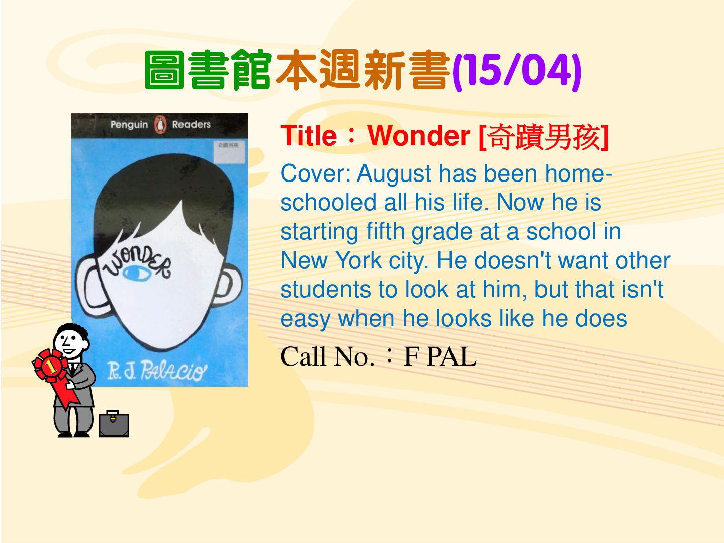 圖書館本週新書(15/04) Title:Wonder [奇蹟男孩] Cover: August has been home- schooled all
