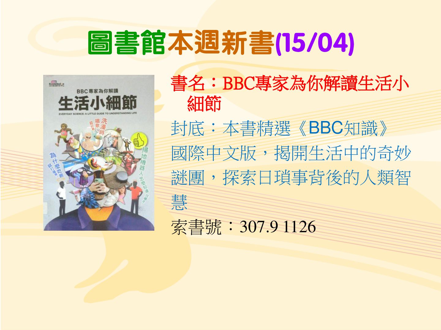 圖書館本週新書(15/04) 書名:BBC專家為你解讀生活小 細節 封底:本書精選《BBC知識》 國際中文版,揭開生活中的奇妙 謎團,探索日瑣事背後的人類智 慧 索書號:307.9 1126