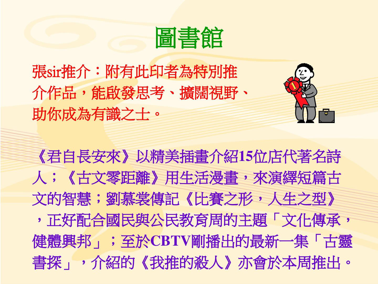 圖書館 張sir推介:附有此印者為特別推 介作品,能啟發思考、擴闊視野、 助你成為有識之士。 《君自長安來》以精美插畫介紹15位店代著名詩 人;《古文零距離》用生活漫畫,來演繹短篇古 文的智慧;劉慕裳傳記《比賽之形,人生之型》 ,正好配合國民與公民教育周的主題「文化傳承, 健體興邦」;至於CBTV剛播出的最新一集「古靈 書探」,介紹的《我推的殺人》亦會於本周推出。
