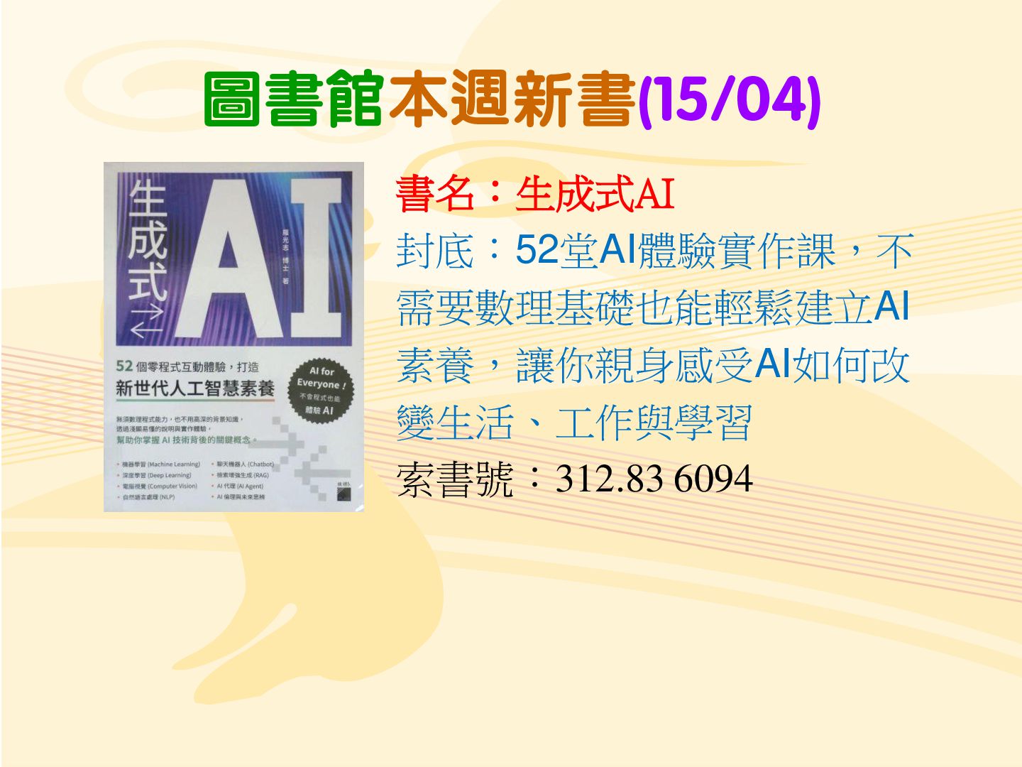 圖書館本週新書(15/04) 書名:生成式AI 封底:52堂AI體驗實作課,不 需要數理基礎也能輕鬆建立AI 素養,讓你親身感受AI如何改 變生活、工作與學習 索書號:312.83 6094