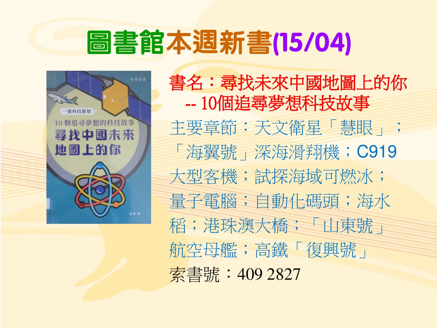 圖書館本週新書(15/04) 書名:尋找未來中國地圖上的你 -- 10個追尋夢想科技故事 主要章節:天文衛星「慧眼」; 「海翼號」深海滑翔機;C919 大型客機;試探海域可燃冰; 量子電腦;自動化碼頭;海水 稻;港珠澳大橋;「山東號」 航空母艦;高鐵「復興號」