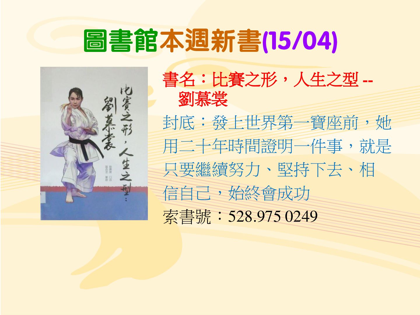 圖書館本週新書(15/04) 書名:比賽之形,人生之型 -- 劉慕裳 封底:發上世界第一寶座前,她 用二十年時間證明一件事,就是 只要繼續努力、堅持下去、相 信自己,始終會成功 索書號:528.975 0249