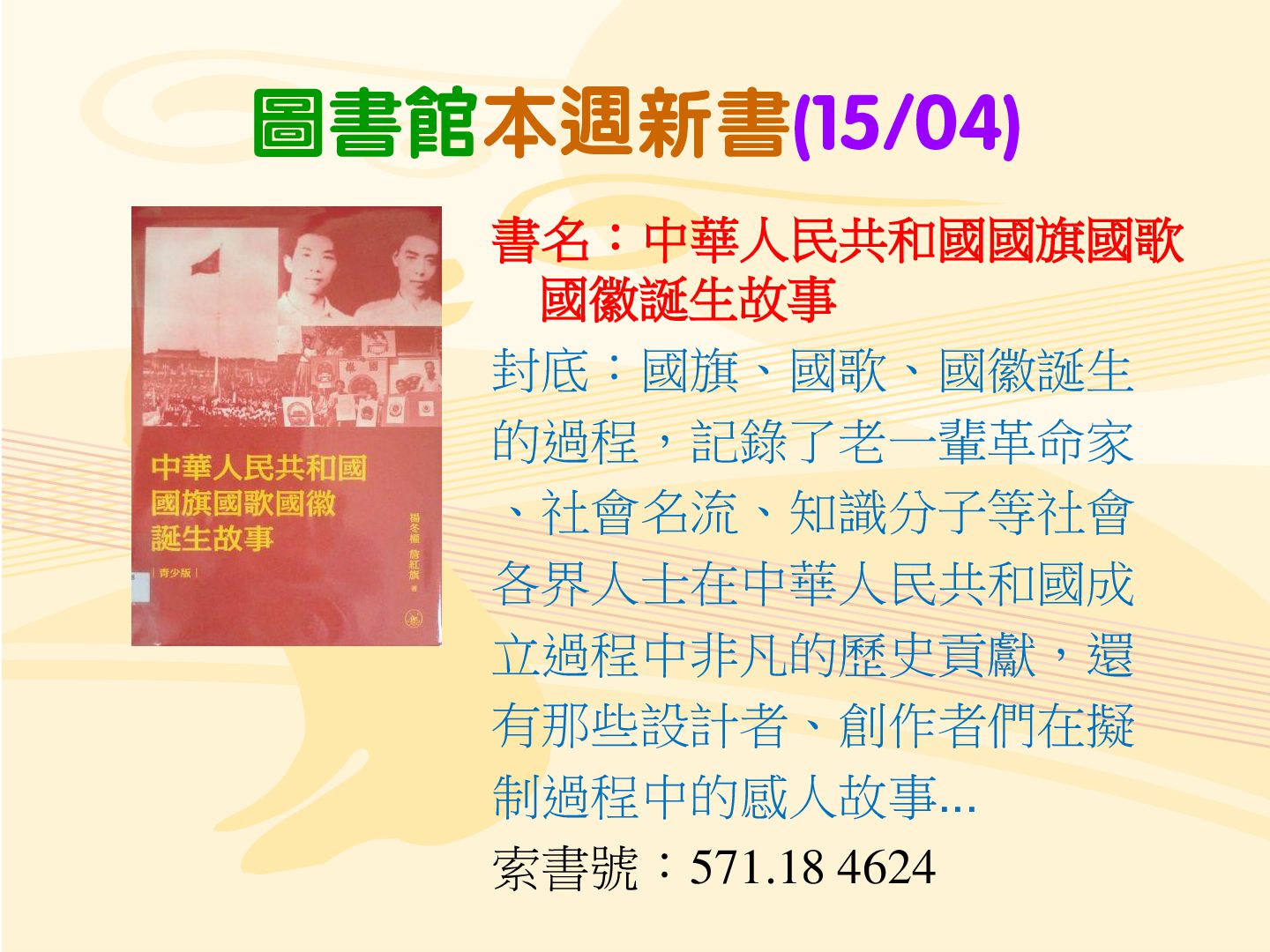 圖書館本週新書(15/04) 書名:中華人民共和國國旗國歌 國徽誕生故事 封底:國旗、國歌、國徽誕生 的過程,記錄了老一輩革命家 、社會名流、知識分子等社會 各界人士在中華人民共和國成 立過程中非凡的歷史貢獻,還 有那些設計者、創作者們在擬 制過程中的感人故事...
