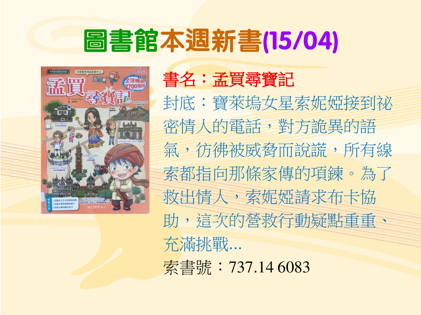 圖書館本週新書(15/04) 書名:孟買尋寶記 封底:寶萊塢女星索妮婭接到祕 密情人的電話,對方詭異的語 氣,彷彿被威脅而說謊,所有線 索都指向那條家傳的項鍊。為了 救出情人,索妮婭請求布卡協 助,這次的營救行動疑點重重、 充滿挑戰... 索書號:737.14