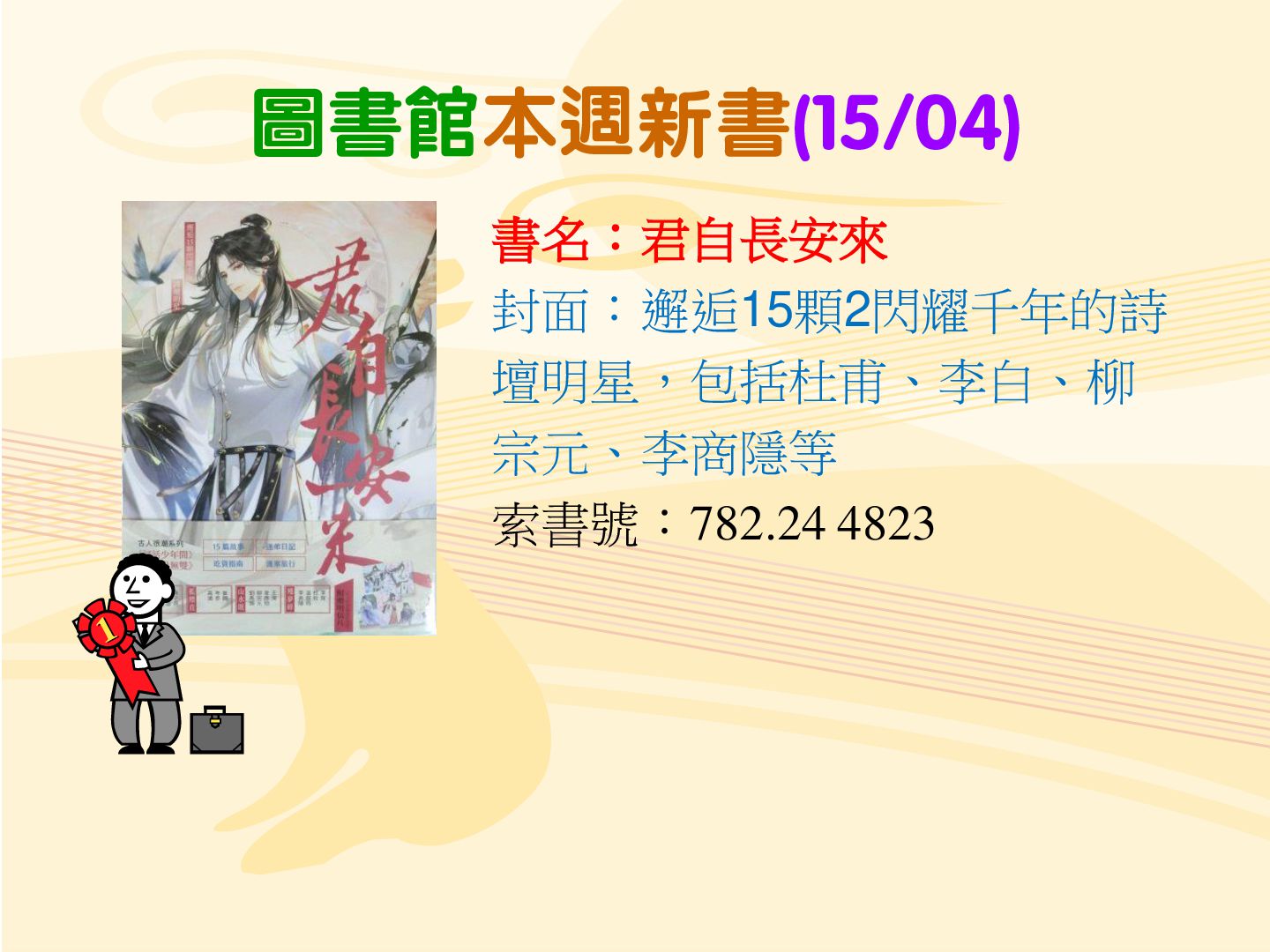圖書館本週新書(15/04) 書名:君自長安來 封面:邂逅15顆2閃耀千年的詩 壇明星,包括杜甫、李白、柳 宗元、李商隱等 索書號:782.24 4823