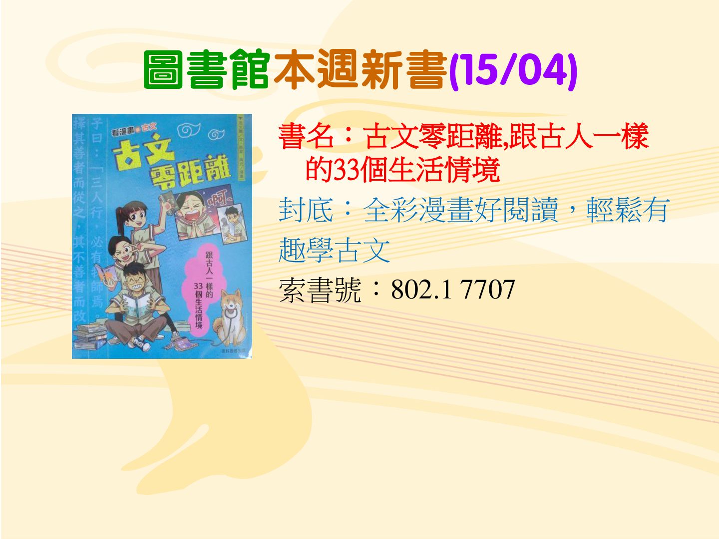 圖書館本週新書(15/04) 書名:古文零距離,跟古人一樣 的33個生活情境 封底:全彩漫畫好閱讀,輕鬆有 趣學古文 索書號:802.1 7707