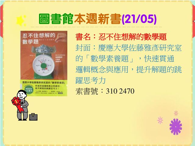 圖書館本週新書(21/05) 書名:忍不住想解的數學題 封面:慶應大學佐藤雅彥研究室 的「數學素養題」,快速貫通 邏輯概念與應用,提升解題的跳 躍思考力 索書號:310 2470