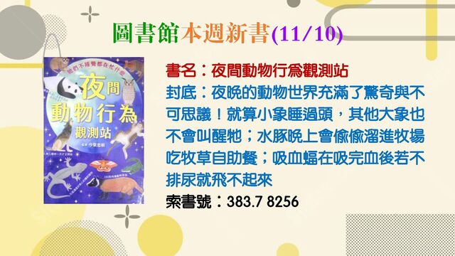 圖書館本週新書(11/10) 書名:夜間動物行為觀測站 封底:夜晚的動物世界充滿了驚奇與不 可思議!就算小象睡過頭,其他大象也 不會叫醒牠;水豚晚上會偷偷溜進牧場 吃牧草自助餐;吸血蝠在吸完血後若不 排尿就飛不起來 索書號:383.7 8256