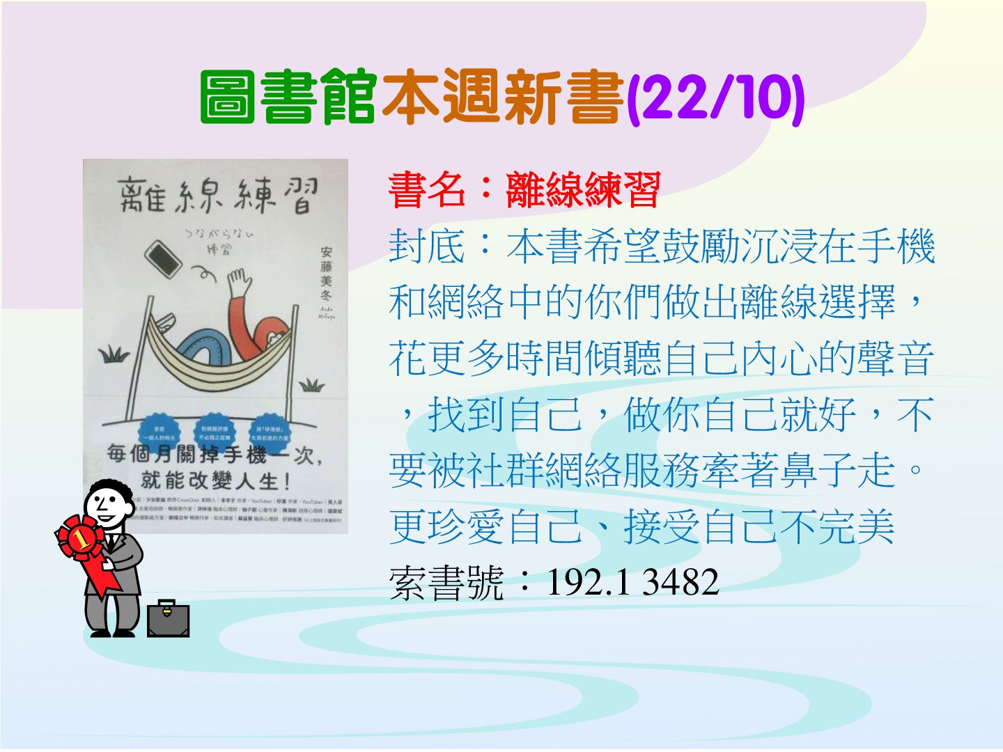 圖書館本週新書(22/10) 書名:離線練習 封底:本書希望鼓勵沉浸在手機 和網絡中的你們做出離線選擇, 花更多時間傾聽自己內心的聲音 ,找到自己,做你自己就好,不 要被社群網絡服務牽著鼻子走。 更珍愛自己、接受自己不完美 索書號:192.1 3482