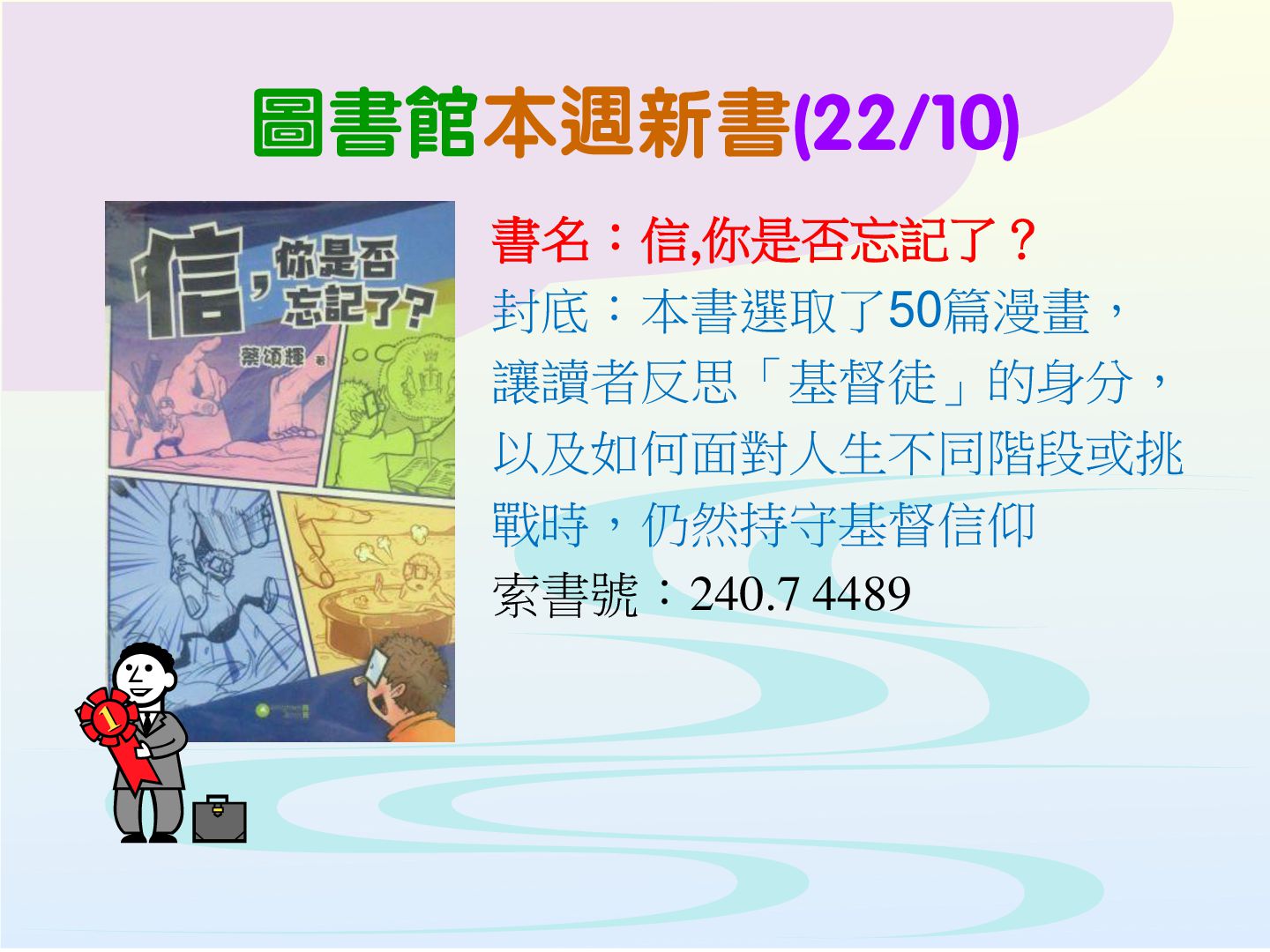 圖書館本週新書(22/10) 書名:信,你是否忘記了? 封底:本書選取了50篇漫畫, 讓讀者反思「基督徒」的身分, 以及如何面對人生不同階段或挑 戰時,仍然持守基督信仰 索書號:240.7 4489