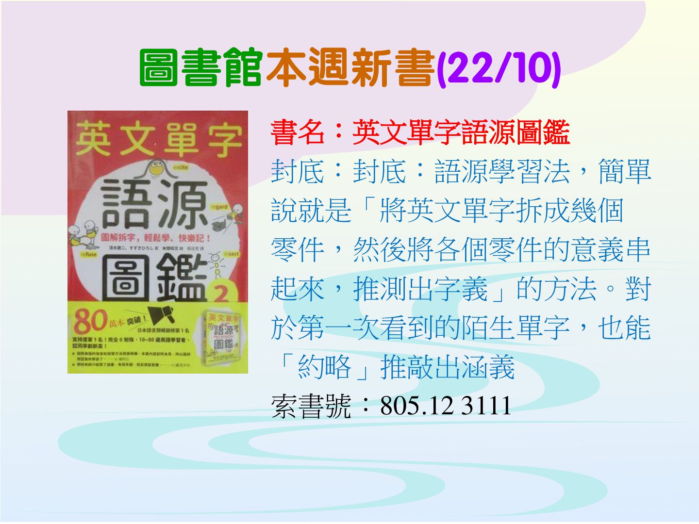 圖書館本週新書(22/10) 書名:英文單字語源圖鑑 封底:封底:語源學習法,簡單 說就是「將英文單字拆成幾個 零件,然後將各個零件的意義串 起來,推測出字義」的方法。對 於第一次看到的陌生單字,也能 「約略」推敲出涵義 索書號:805.12 3111
