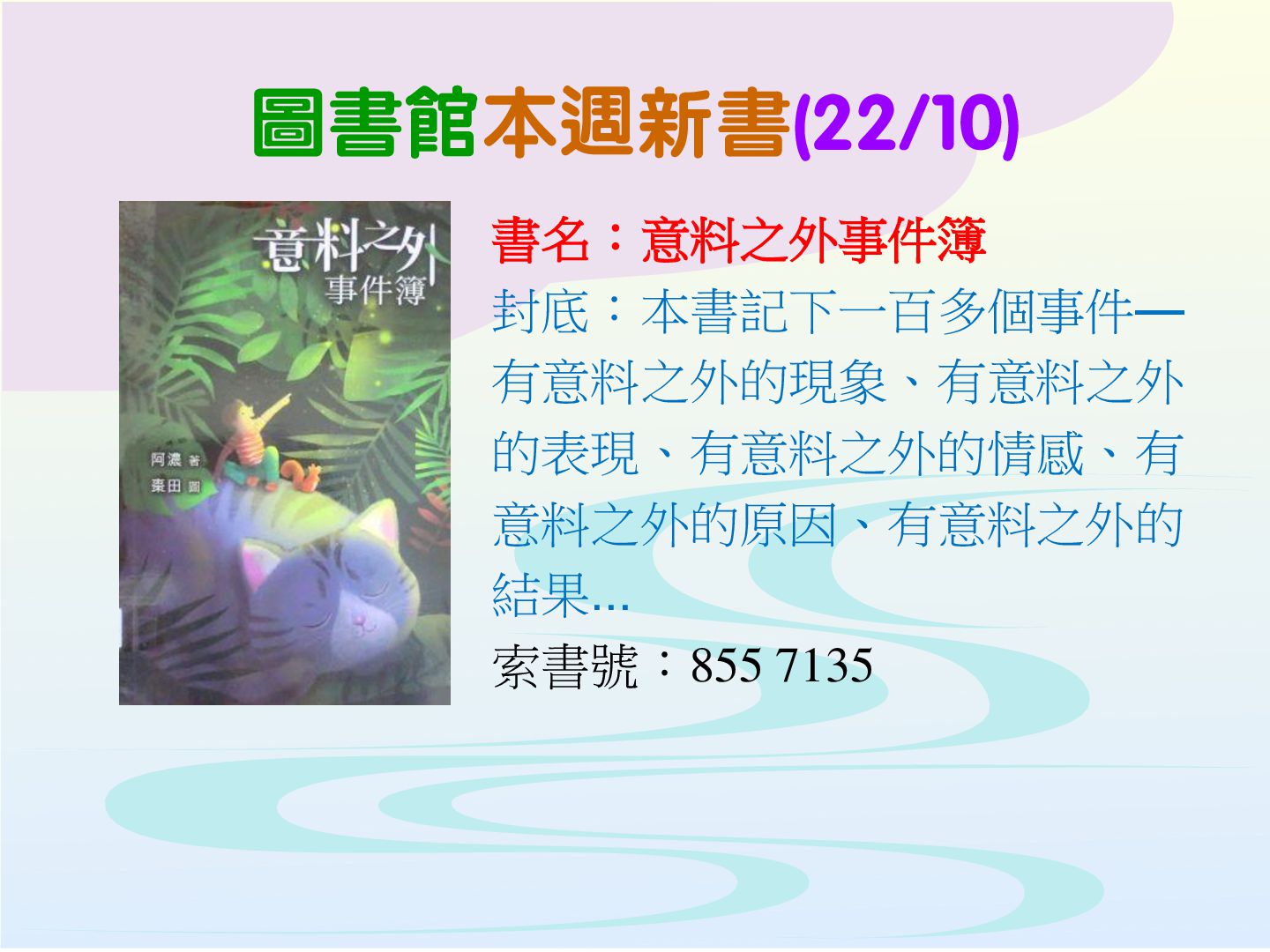 圖書館本週新書(22/10) 書名:意料之外事件簿 封底:本書記下一百多個事件— 有意料之外的現象、有意料之外 的表現、有意料之外的情感、有 意料之外的原因、有意料之外的 結果... 索書號:855 7135