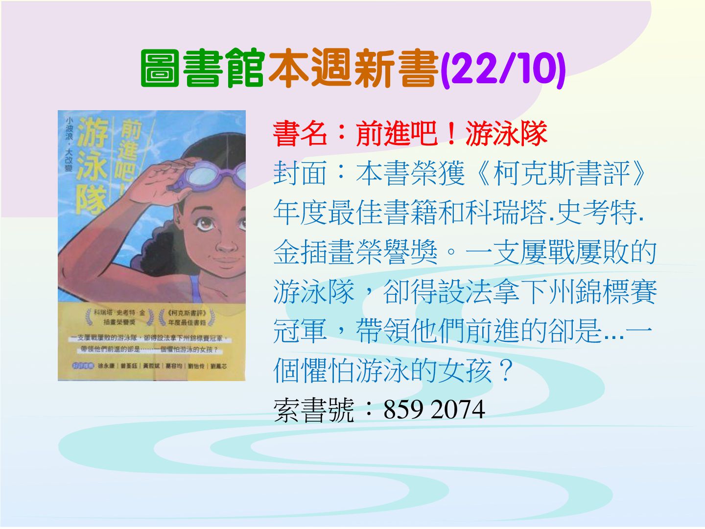 圖書館本週新書(22/10) 書名:前進吧!游泳隊 封面:本書榮獲《柯克斯書評》 年度最佳書籍和科瑞塔.史考特. 金插畫榮譽獎。一支屢戰屢敗的 游泳隊,卻得設法拿下州錦標賽 冠軍,帶領他們前進的卻是...一 個懼怕游泳的女孩? 索書號:859 2074
