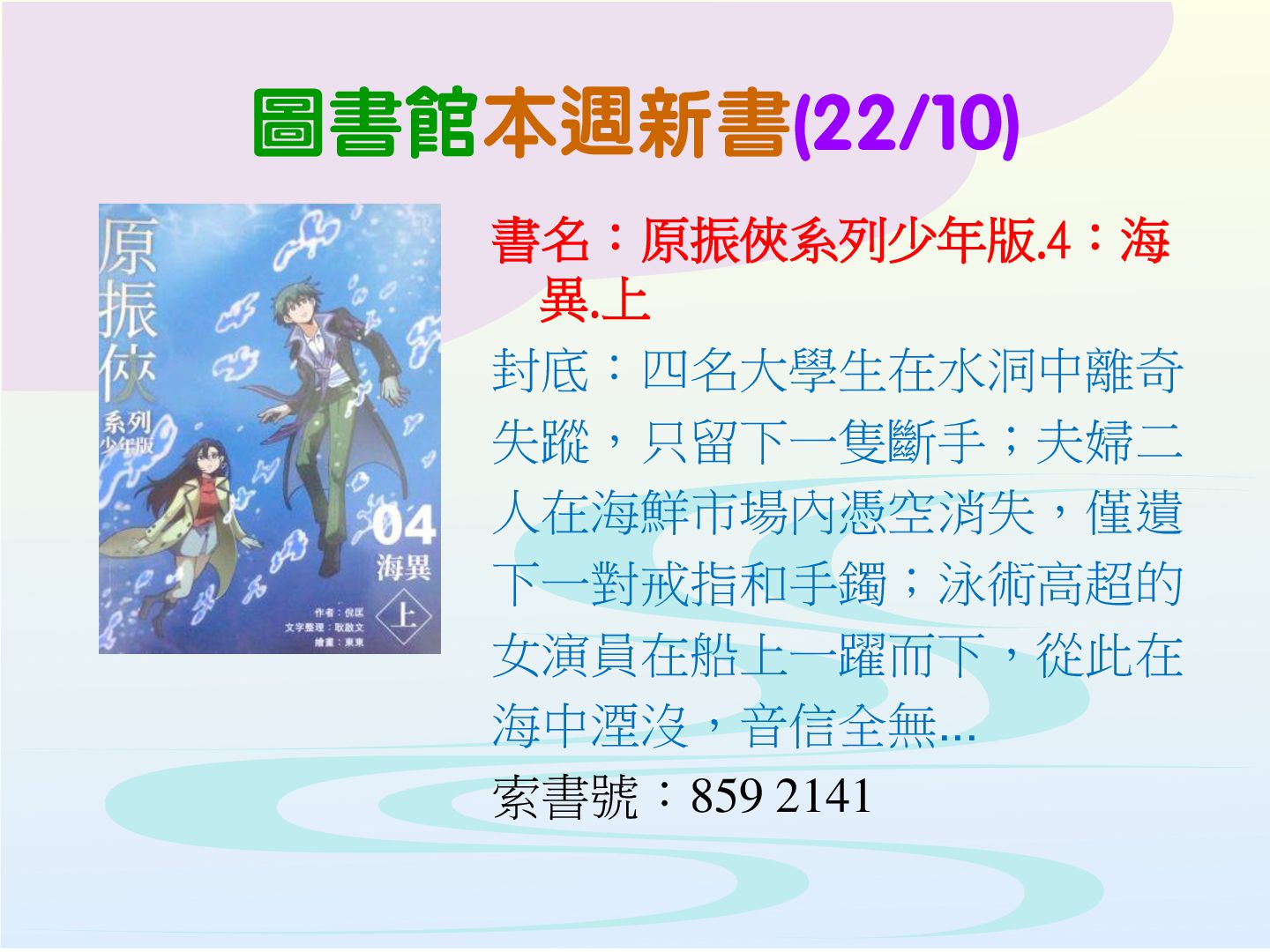 圖書館本週新書(22/10) 書名:原振俠系列少年版.4:海 異.上 封底:四名大學生在水洞中離奇 失蹤,只留下一隻斷手;夫婦二 人在海鮮市場內憑空消失,僅遺 下一對戒指和手鐲;泳術高超的 女演員在船上一躍而下,從此在 海中湮沒,音信全無... 索書號:859