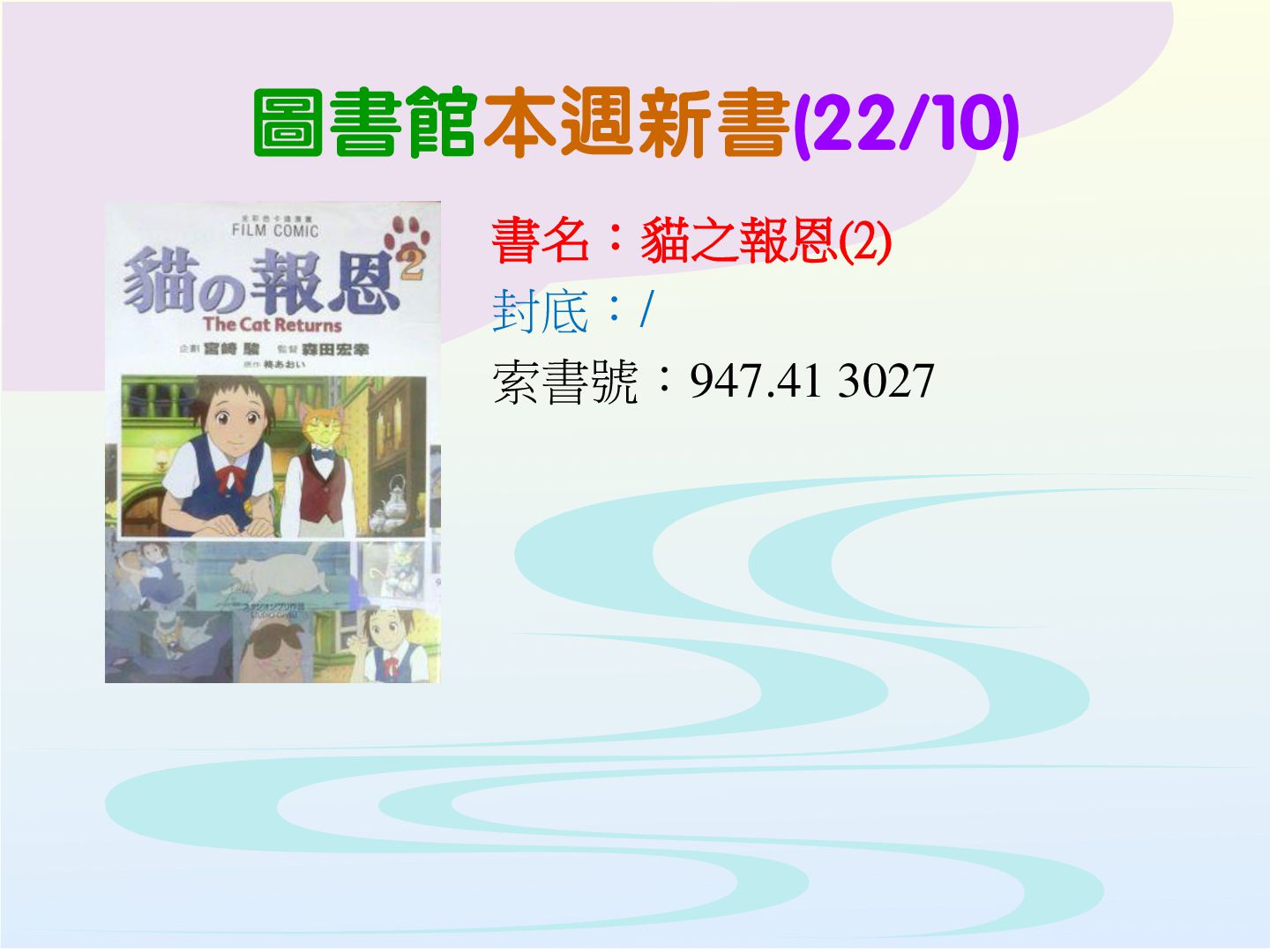 圖書館本週新書(22/10) 書名:貓之報恩(2) 封底:/ 索書號:947.41 3027