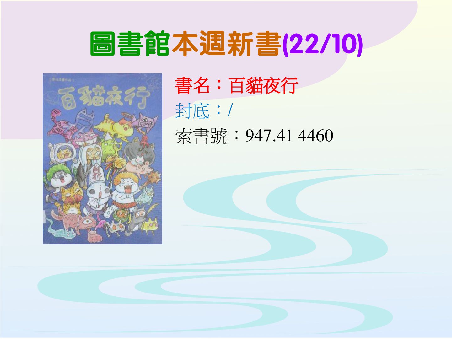 圖書館本週新書(22/10) 書名:百貓夜行 封底:/ 索書號:947.41 4460