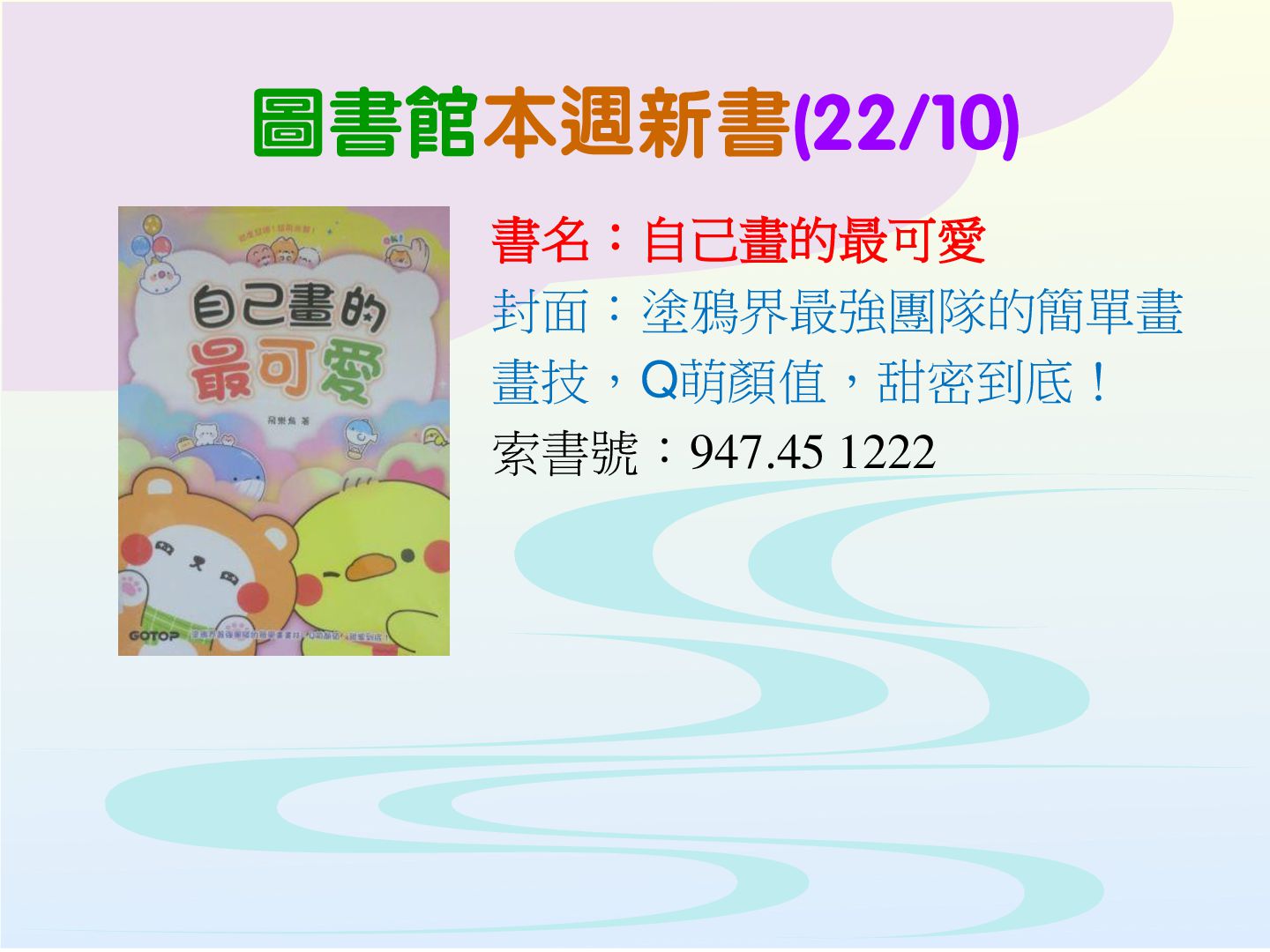 圖書館本週新書(22/10) 書名:自己畫的最可愛 封面:塗鴉界最強團隊的簡單畫 畫技,Q萌顏值,甜密到底! 索書號:947.45 1222