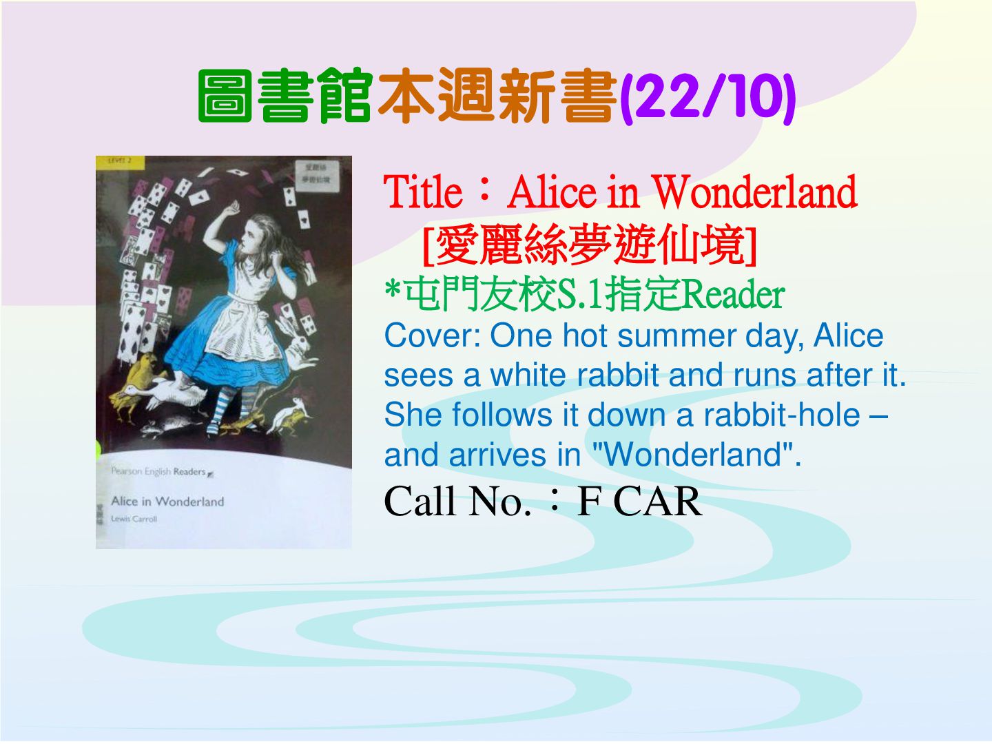 圖書館本週新書(22/10) Title:Alice in Wonderland [愛麗絲夢遊仙境] *屯門友校S.1指定Reader Cover: One hot summer