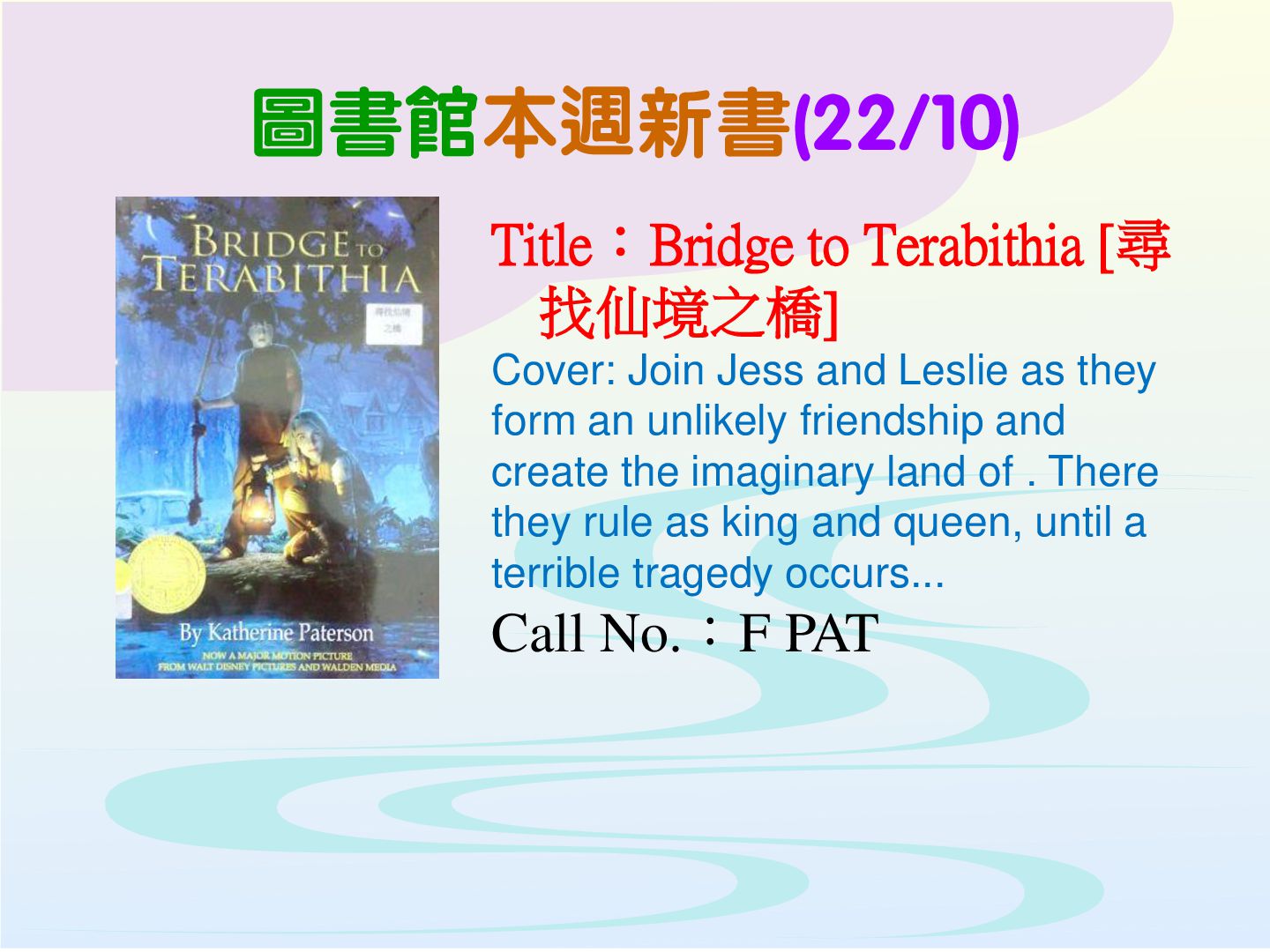 圖書館本週新書(22/10) Title:Bridge to Terabithia [尋 找仙境之橋] Cover: Join Jess and