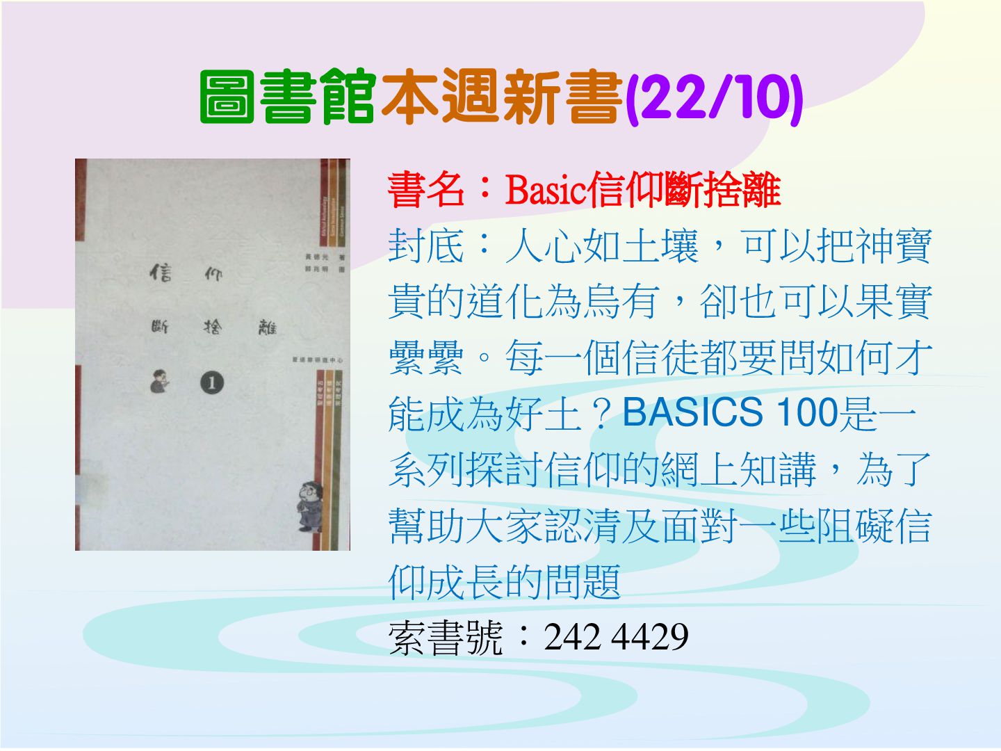 圖書館本週新書(22/10) 書名:Basic信仰斷捨離 封底:人心如土壤,可以把神寶 貴的道化為烏有,卻也可以果實 纍纍。每一個信徒都要問如何才 能成為好土?BASICS 100是一 系列探討信仰的網上知講,為了 幫助大家認清及面對一些阻礙信 仰成長的問題